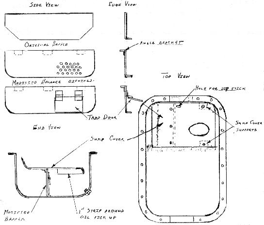 Being cheap and of the experimental type, I decided to modify my oil pan myself. Never having done this before, I carefully studied and sketched the Twin Cam Enterprises modified pan. Also, I studied what has been done with standard American cars (particularly high performance Chrysler products). I then sketched out my own solutions and began to worry if the baffling technique which I was to use would restrict the flow to the oil pump. After all, not being a hydraulic engineer, I questioned what the oil was really doing inside the sump. Well, after much concern and several sketches, I got out my welding torch and modified the sump. The sump has been back on my car for 8,000 miles, has caused no negative problems, and as far as I can tell, it has corrected the original problem of losing oil pressure on right hand turns. Here is my solution